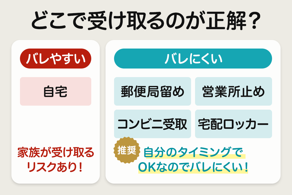 また、配送についても「家族にバレたくない」という方は、受け取り場所や時間を少し工夫することで、リスクを抑えることができます。